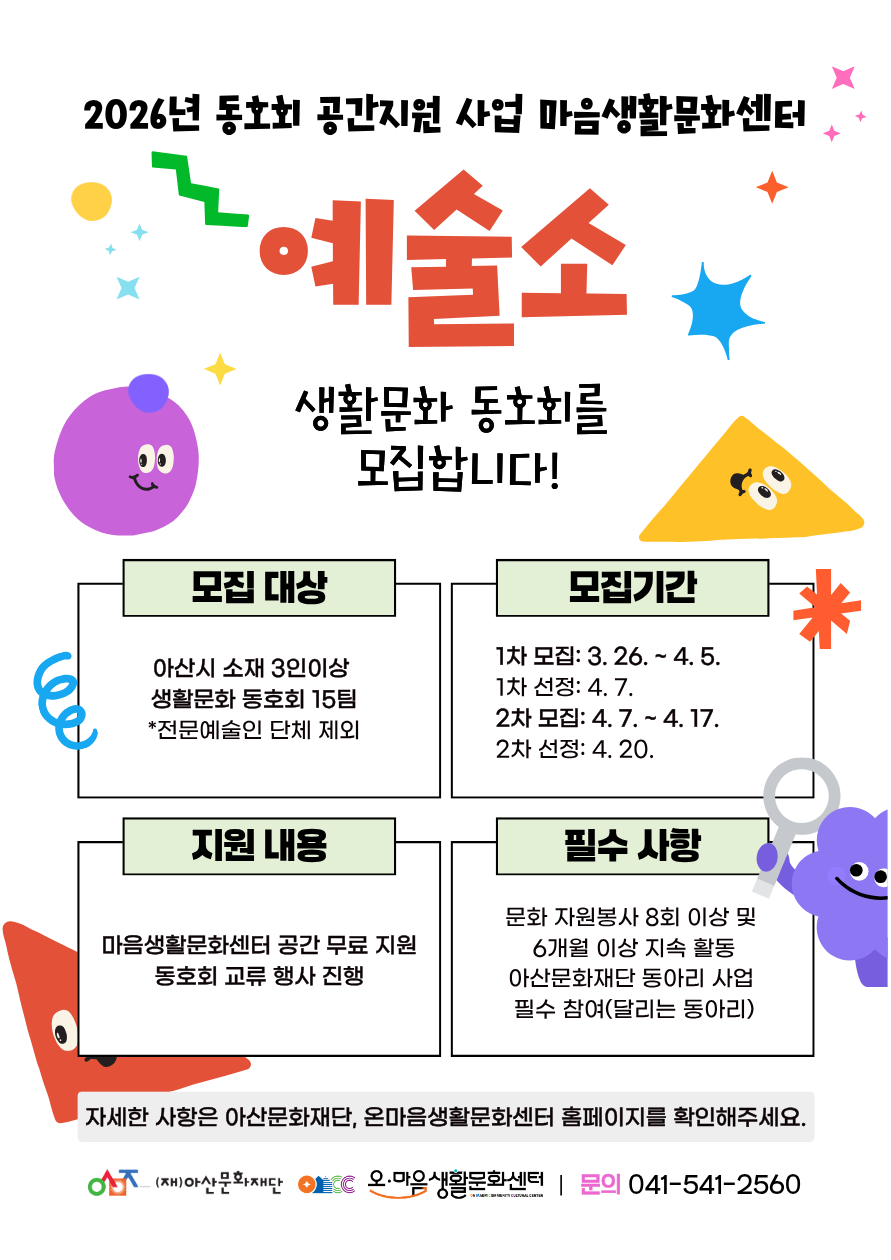 2026 예술달구지 참여기관 추가 모집 안내(재)아산문화재단에서 장애인의 문화예술 향유 지원을 위해 2026 예술달구지 사업 참여기관을 모집합니다. 접수기간: 2026. 3. 24.(화) ~ 3. 29.(일) 24:00까지접수방법: 이메일 접수 afaclife@gmail.com모집상세: 아래 공고문 및 양식 참고
