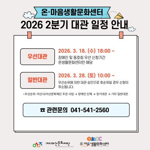 - (정정) 2026 온·마음생활문화센터 상반기 문화강좌(2분기) 수강생 모집 안내2026.03.10.
